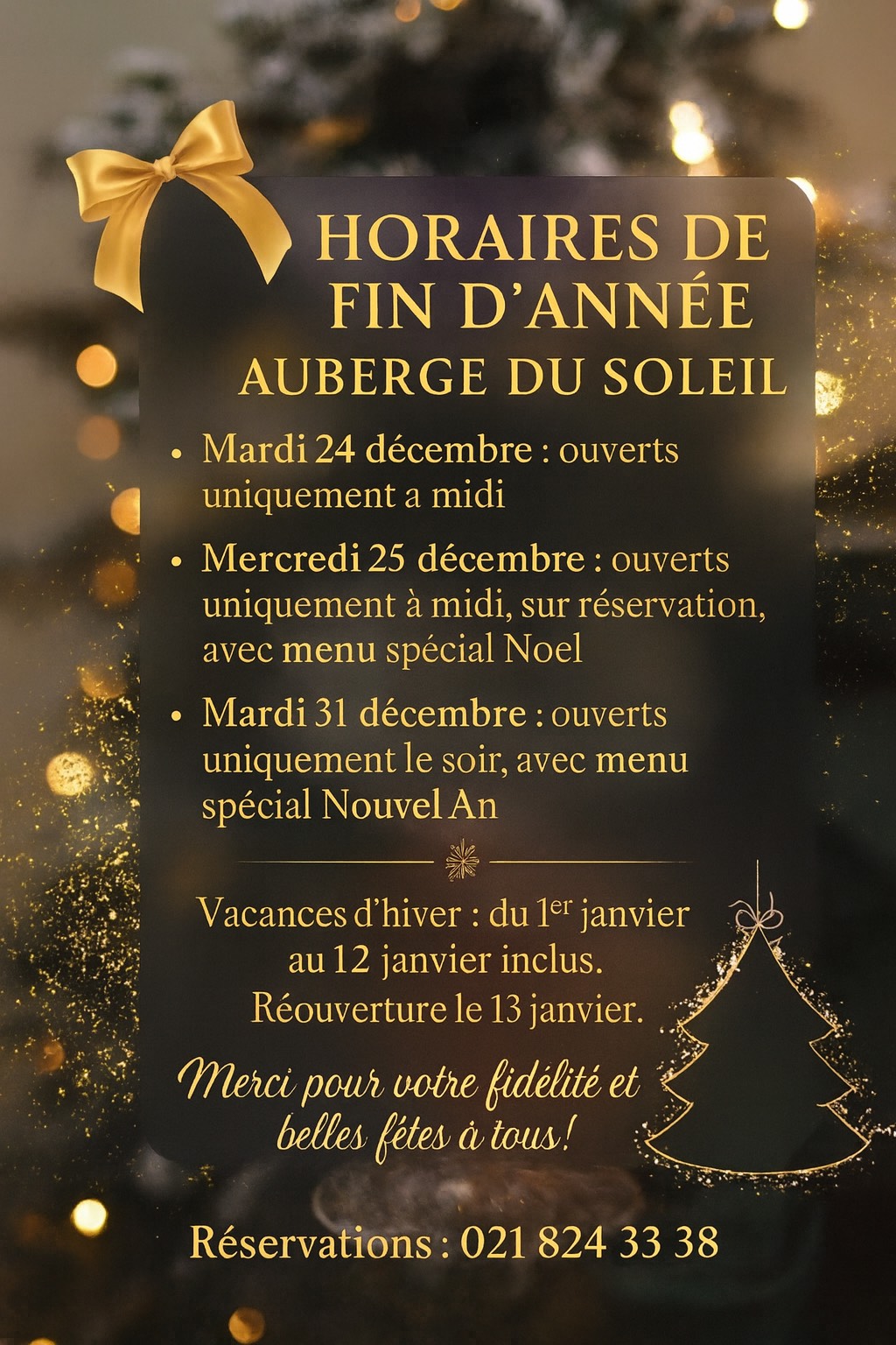 Située au cœur du vignoble de la Côte Vaudoise, entre Genève et Lausanne, et dominant la région de Rolle, l’Auberge du Soleil se trouve dans le charmant village viticole de Bursins, classé site clunisien. Cet établissement chaleureux offre un cadre authentique et convivial pour vos événements privés ou professionnels. Avec une capacité d’accueil allant jusqu’à 200 personnes, notre salon particulier et notre salle de banquet sont idéaux pour célébrer vos moments en famille, entre amis ou avec vos collègues. L’auberge est désormais dirigée par un jeune couple dynamique, Ibrahim Velija et Maria Couto, qui ont repris cet établissement communal avec passion et dévouement.
